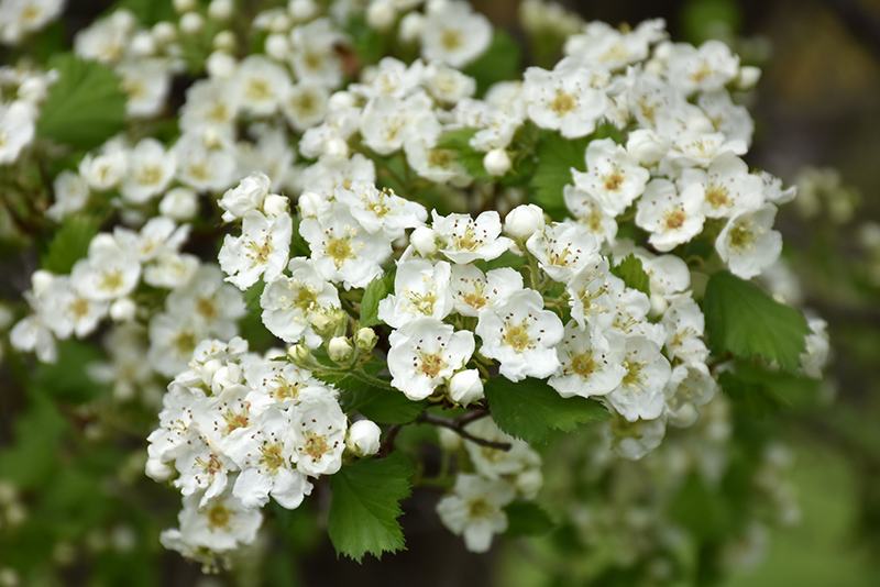 Snowbird Hawthorn is draped in stunning clusters of double white flowers held atop the branches in mid spring. It has forest green deciduous foliage. The serrated lobed leaves do not develop any appreciable fall color.