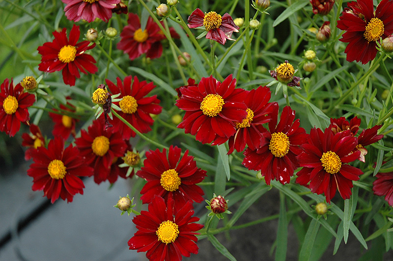 Mercury Rising Tickseed is smothered in stunning burgundy daisy flowers with violet overtones, yellow eyes and scarlet edges at the ends of the stems from early summer to early fall. The flowers are excellent for cutting. Its ferny leaves remain emerald green in color throughout the season.