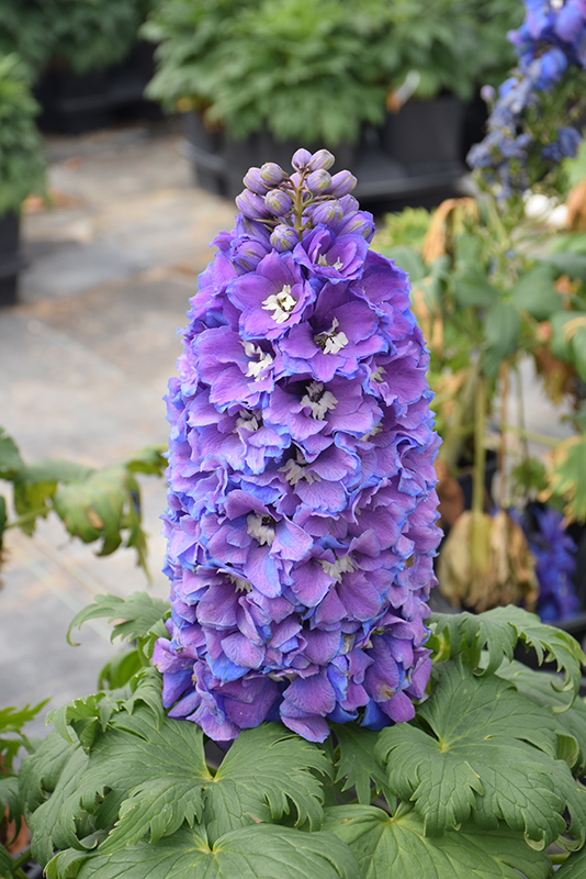 Guardian Blue Larkspur will grow to be about 24 inches tall at maturity extending to 4 feet tall with the flowers, with a spread of 18 inches. When grown in masses or used as a bedding plant, individual plants should be spaced approximately 12 inches apart. It tends to be leggy, with a typical clearance of 1 foot from the ground, and should be underplanted with lower-growing perennials. The flower stalks can be weak and so it may require staking in exposed sites or excessively rich soils. It grows at a medium rate, and under ideal conditions can be expected to live for approximately 10 years. As an herbaceous perennial, this plant will usually die back to the crown each winter, and will regrow from the base each spring. Be careful not to disturb the crown in late winter when it may not be readily seen!