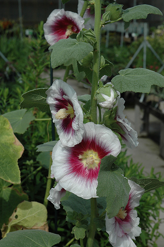 Creme de Cassis Hollyhock features bold spikes of semi-double white round flowers with yellow eyes and ruby-red centers rising above the foliage from mid summer to early fall. The flowers are excellent for cutting. Its large round leaves remain green in color throughout the season.