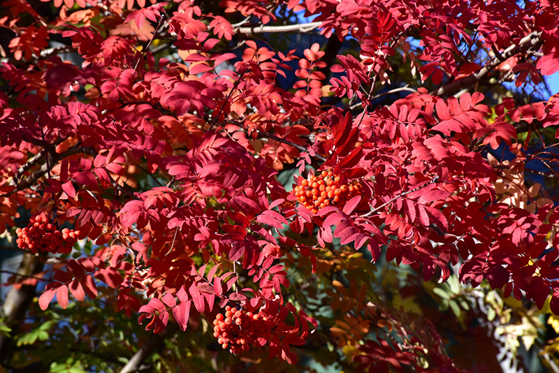 Showy Mountain Ash features showy clusters of white flowers held atop the branches in mid spring. The red fruits are held in abundance in spectacular clusters from early to late fall. It has dark green deciduous foliage. The oval compound leaves turn an outstanding red in the fall. The smooth gray bark adds an interesting dimension to the landscape.