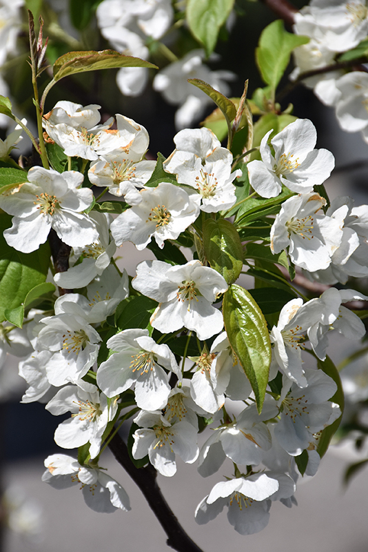 An exceptionally showy ornamental tree that's bathed in white flowers in spring and colorful orange-red fruit in fall, spreading habit of growth, hardy; makes a wonderful feature tree in the landscape, needs well-drained soil and full sun